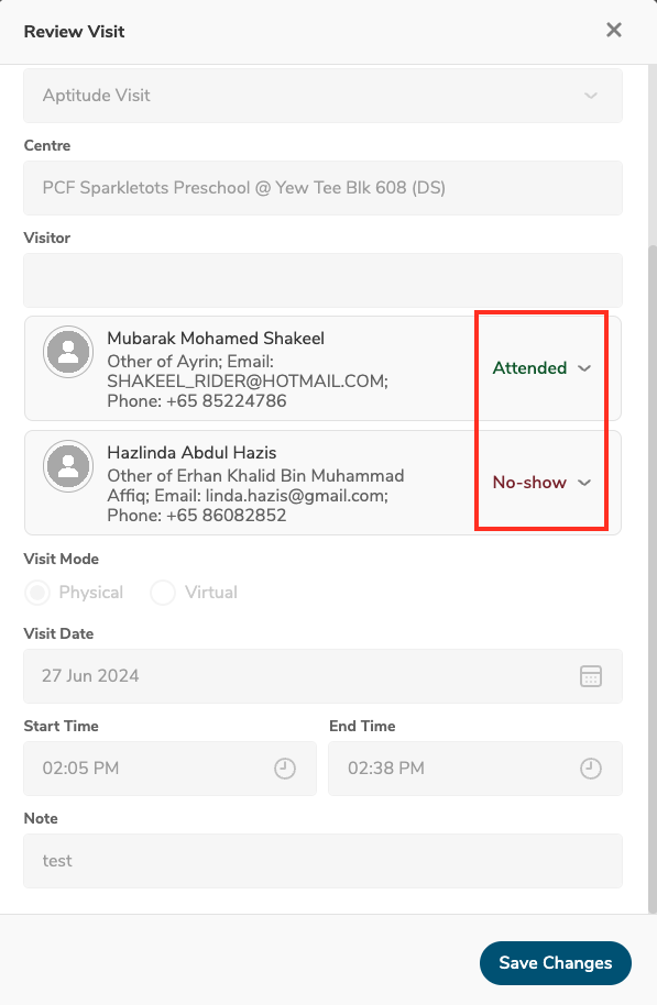 Step 4: In the Review Visit window, update the visitor attendance status to “Attended” or “No-show”