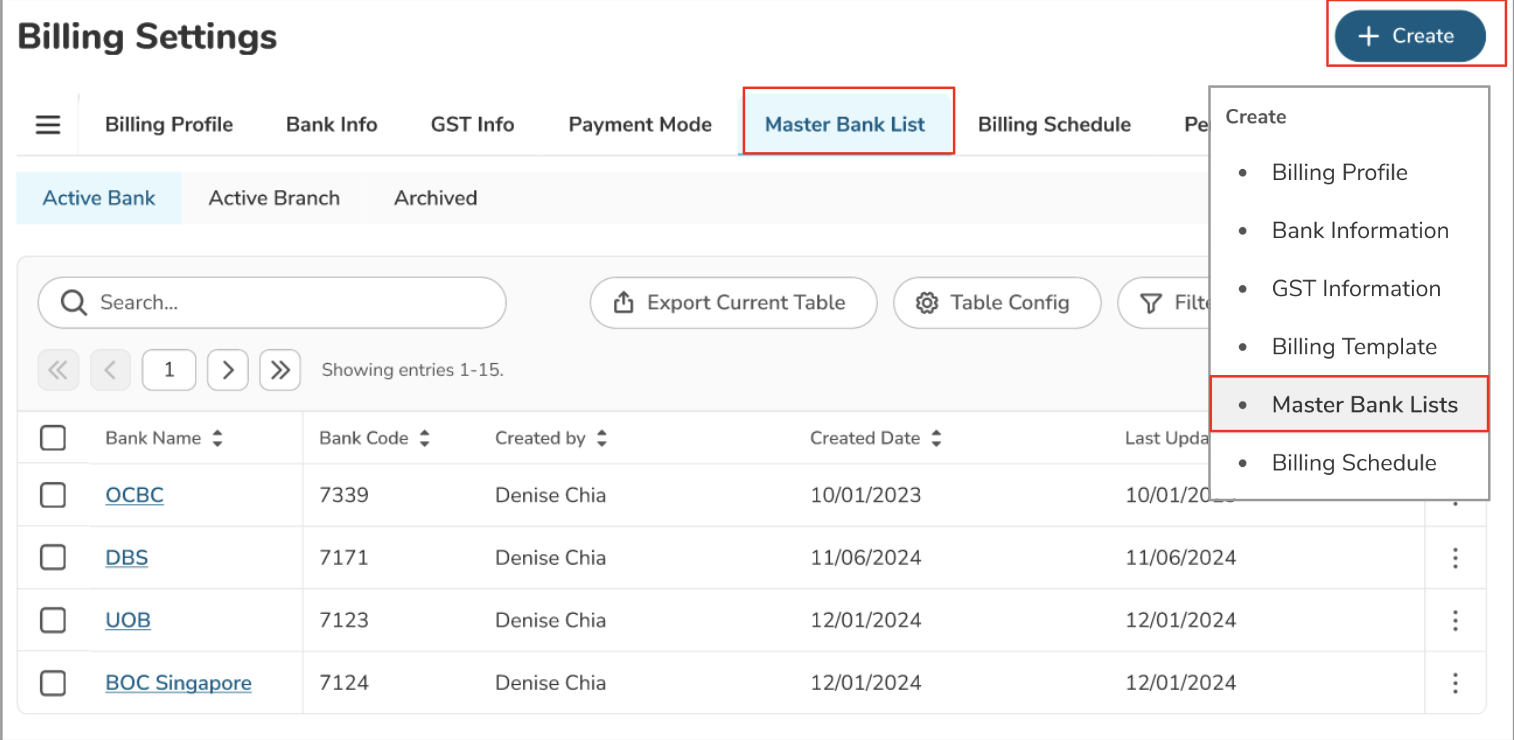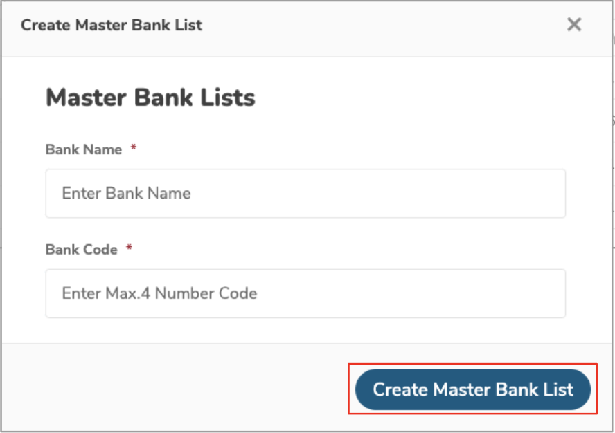 Under the Master Bank List tab, click the + Create button, and select Master Bank Lists.