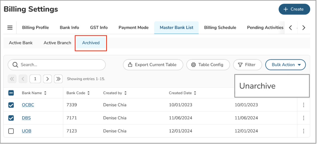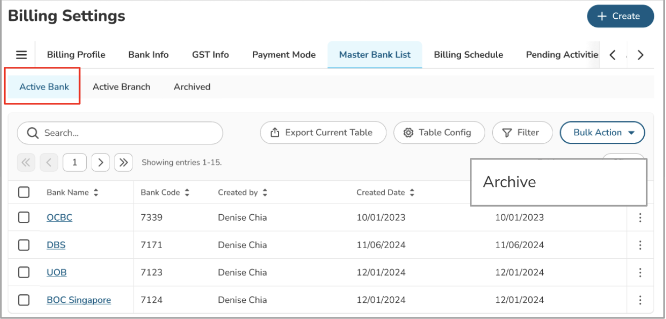 Note: Archived banks will be automatically removed from the HQ bank list and all associated centres.