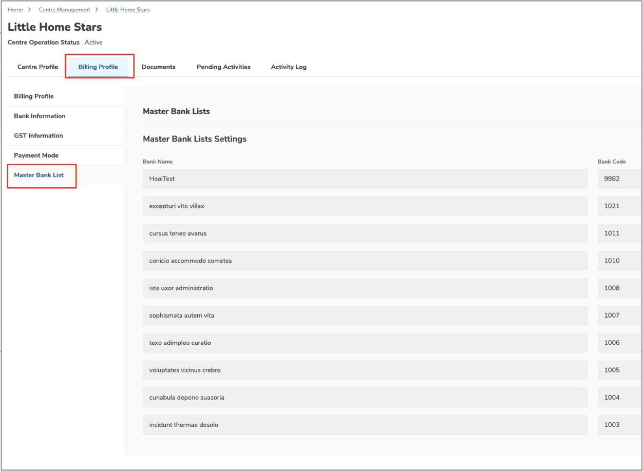 Once the bank information is created, it will be automatically assigned to all centres under that HQ.