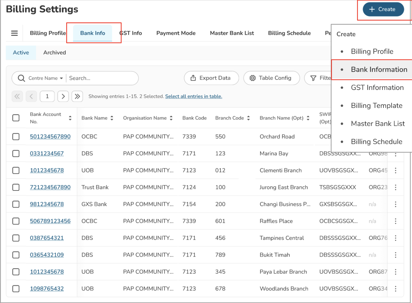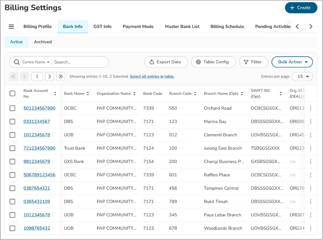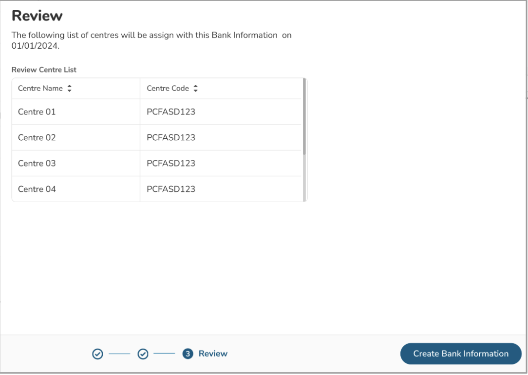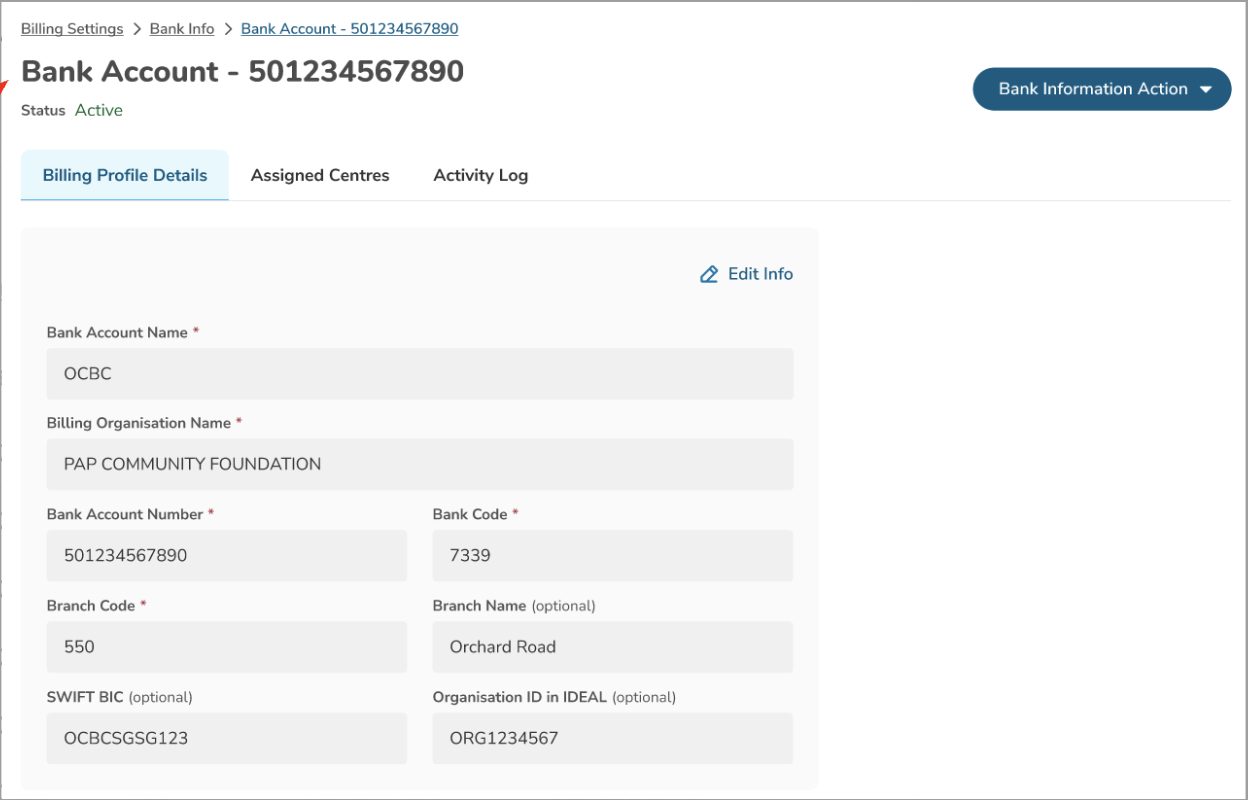 Each centre can only have one bank info. Assigning a new one will replace the existing bank info, set its end date to 1 day before the assigned date, and log the change in the Activity Log.