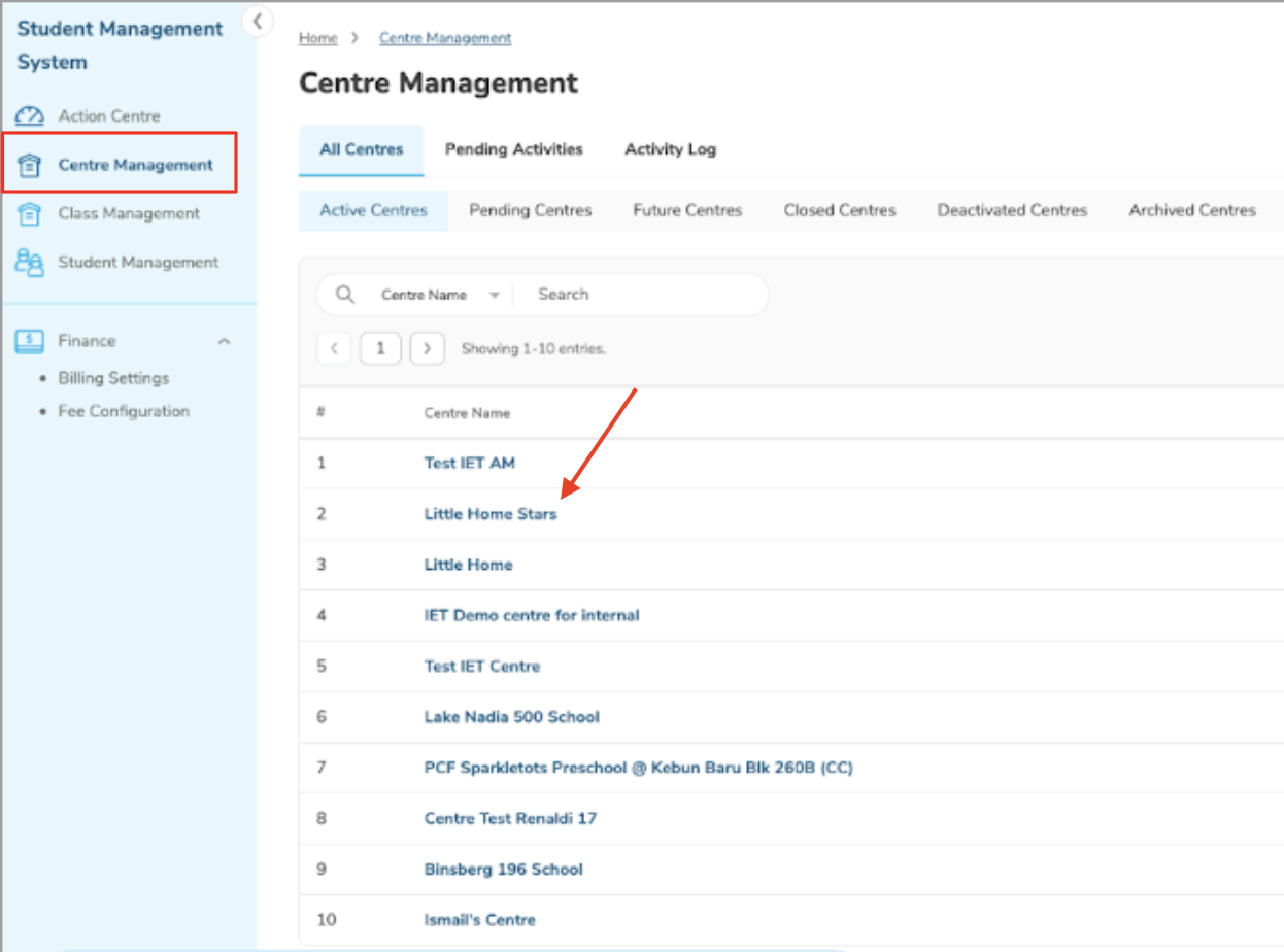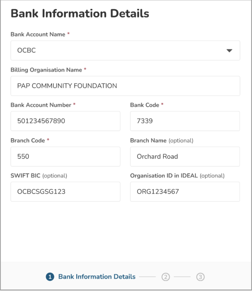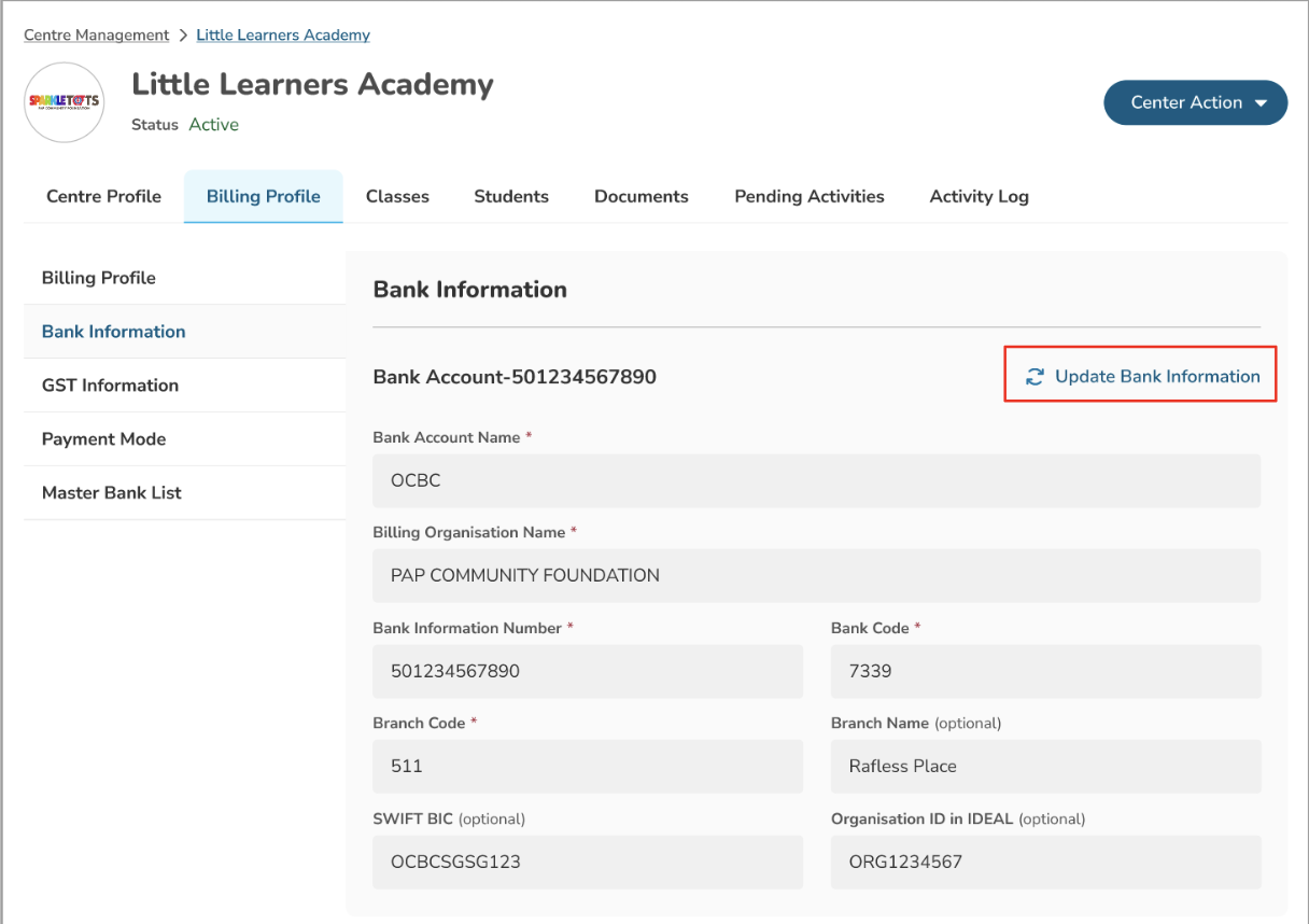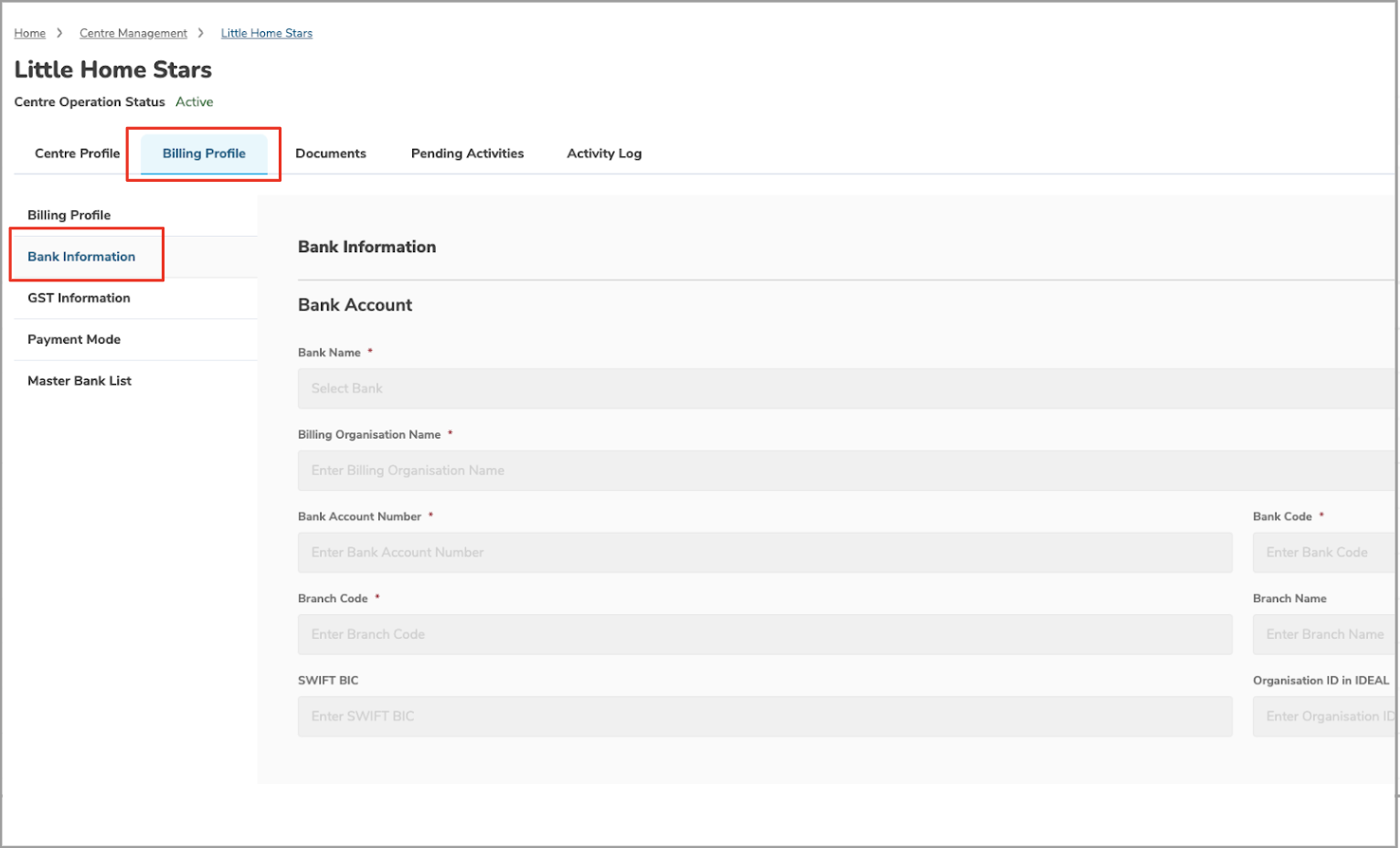 On the centre’s profile page, go to the Billing Profile tab and select the Bank Information section.