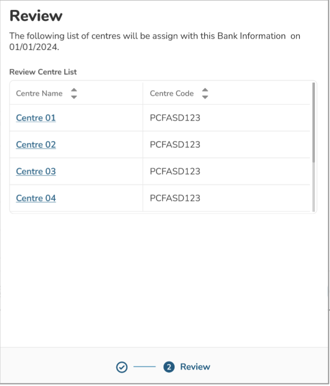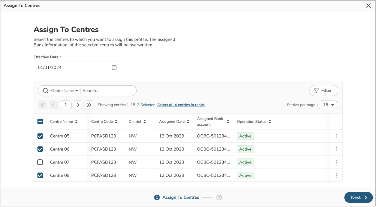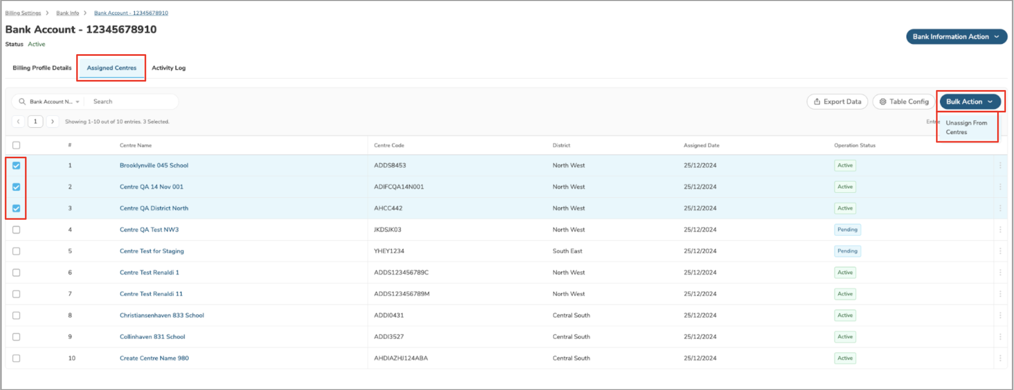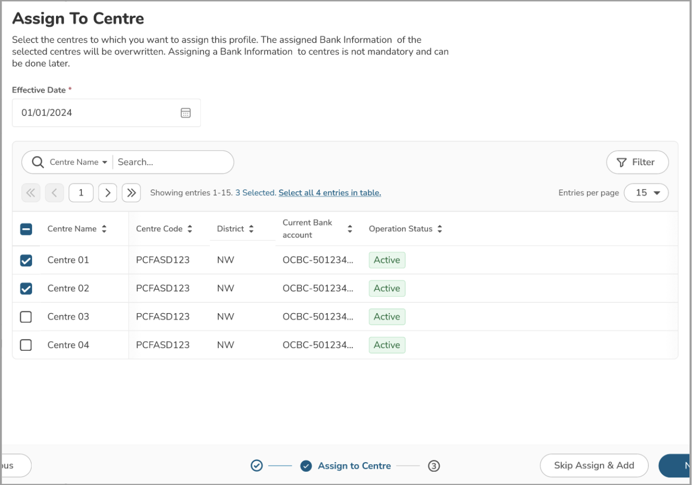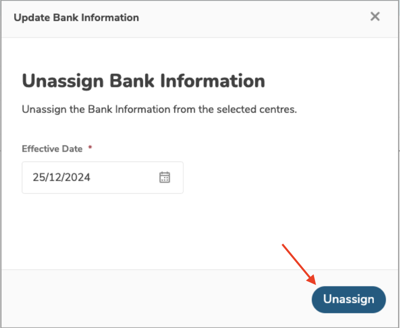 Unassigned centres will be removed from the bank info’s assigned list, and the current bank info's end date will be set to one day before the effective date.