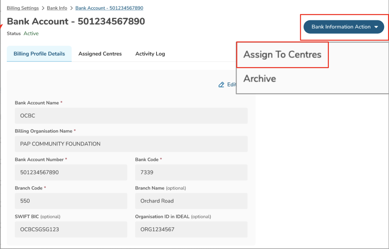 On the bank account profile page, click the Bank Information Action button, then select Assign To Centres.