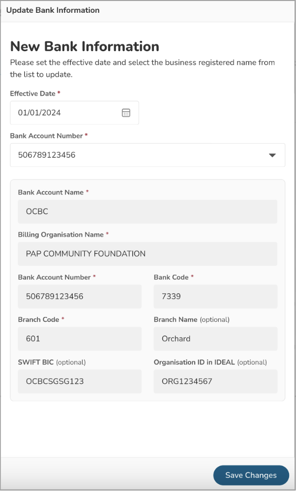 Upon saving, if no prior bank info exists, the new one will apply from the effective date.