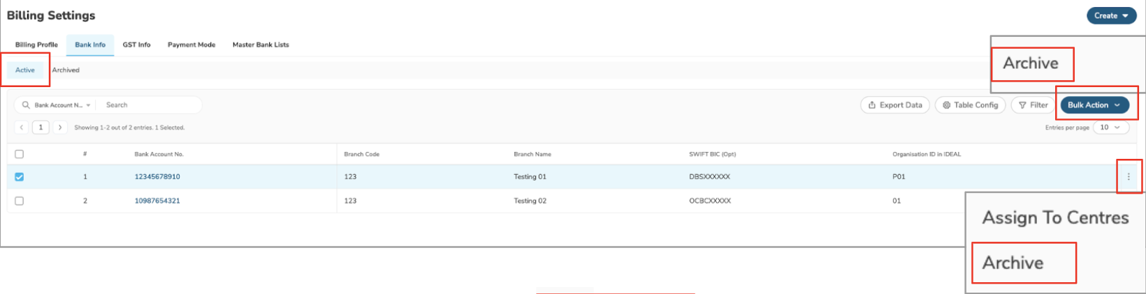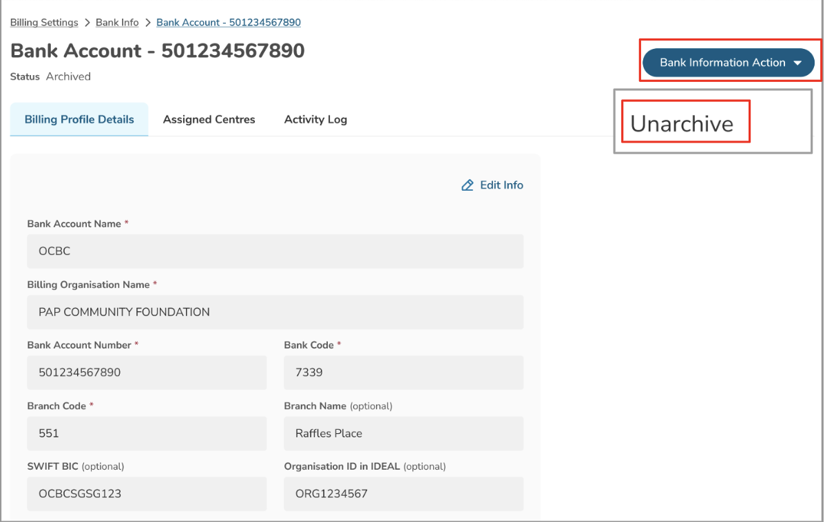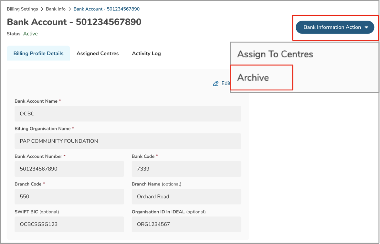 Note: You must unassign the bank info from any centre(s) before archiving it.