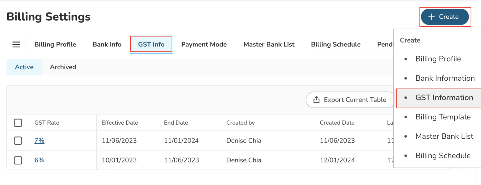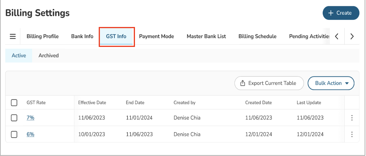 Billing documents will show the applicable GST rate based on the effective and end dates.