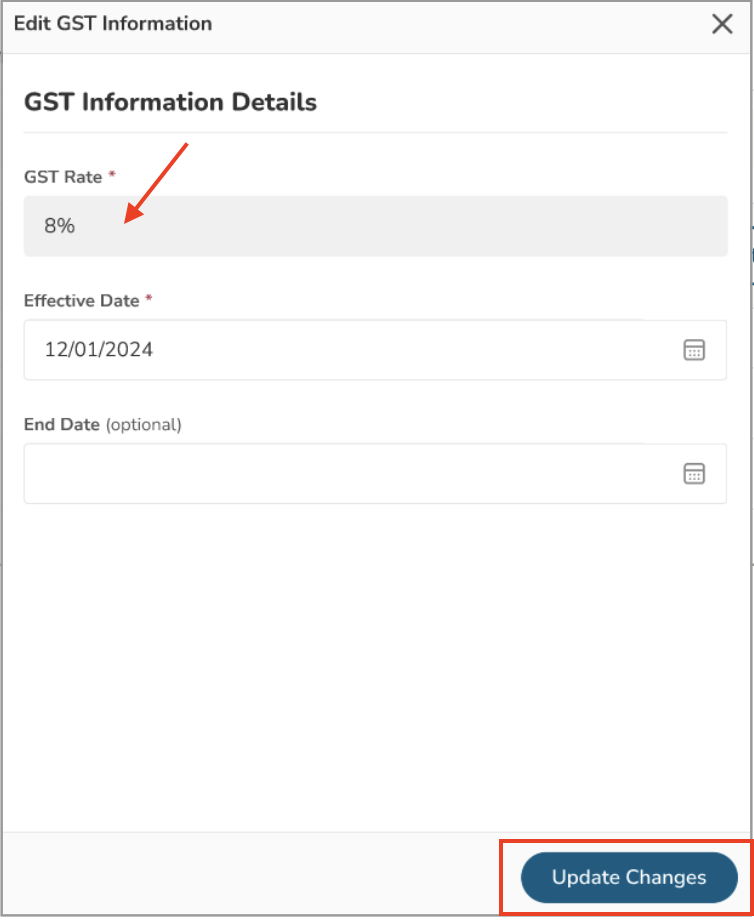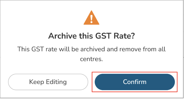 Once saved, the new GST information will be updated and applied to all centres using that rate.