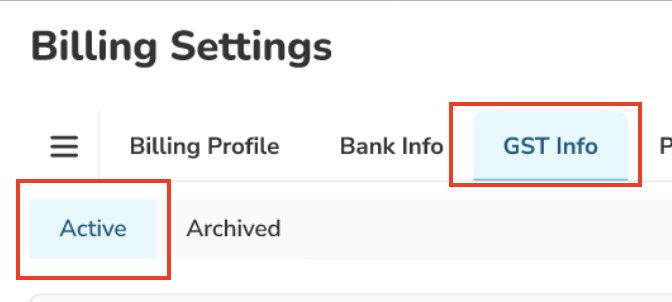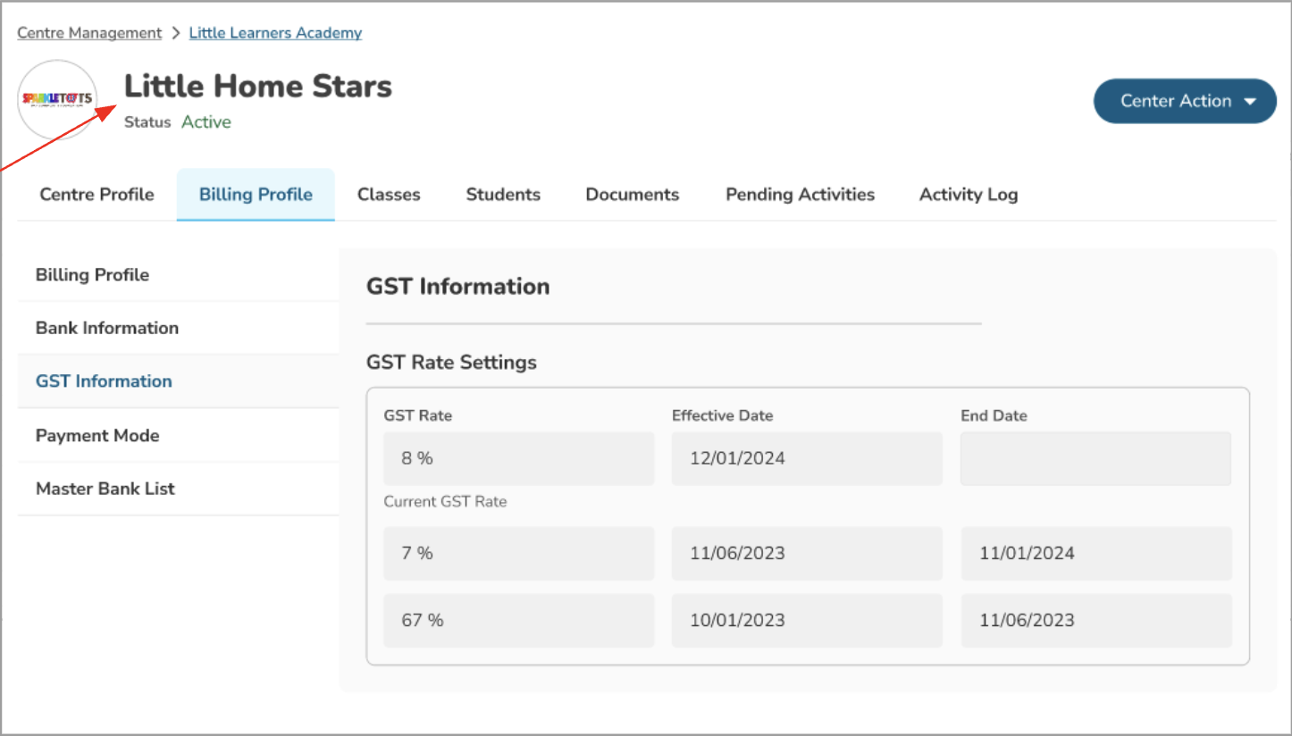 On the centre’s profile page, go to the Billing Profile tab and select the GST Information section.