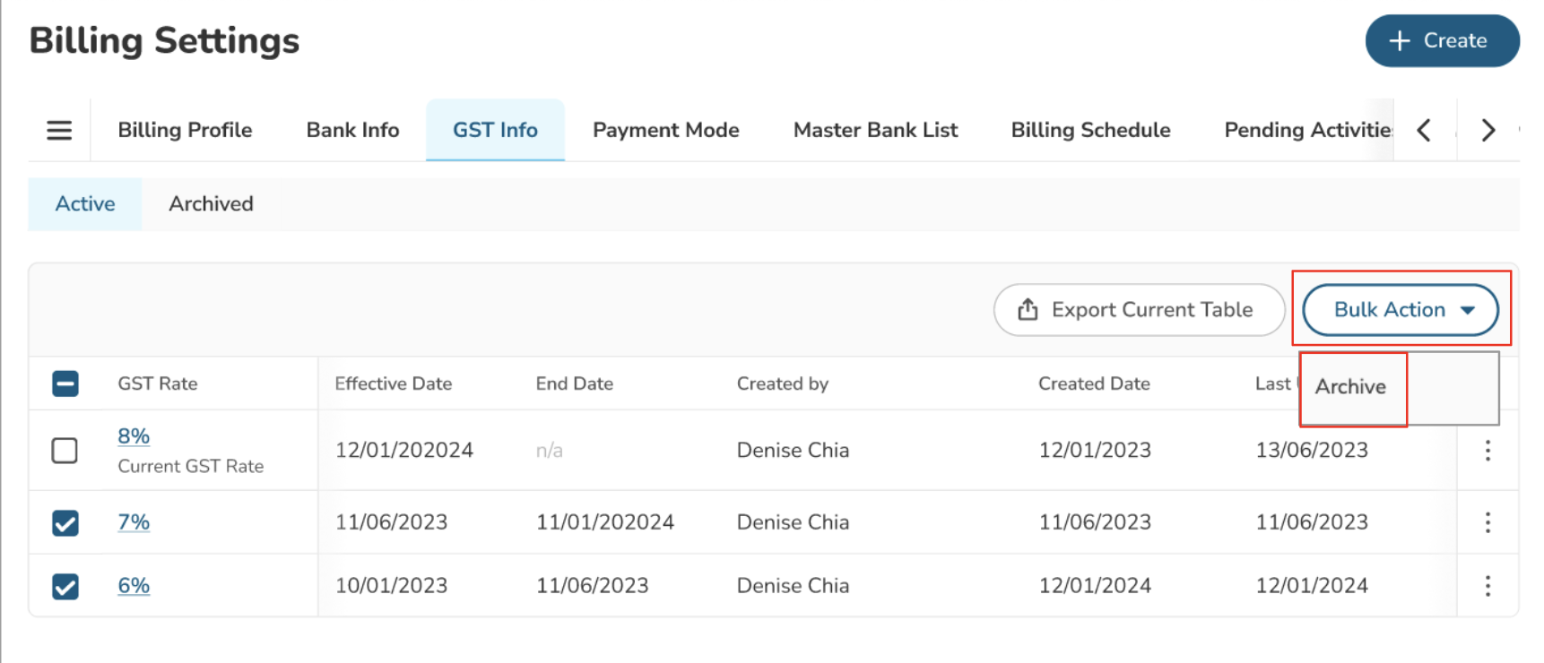 GST rates with a current effective date cannot be archived. An error message will appear if this is attempted.