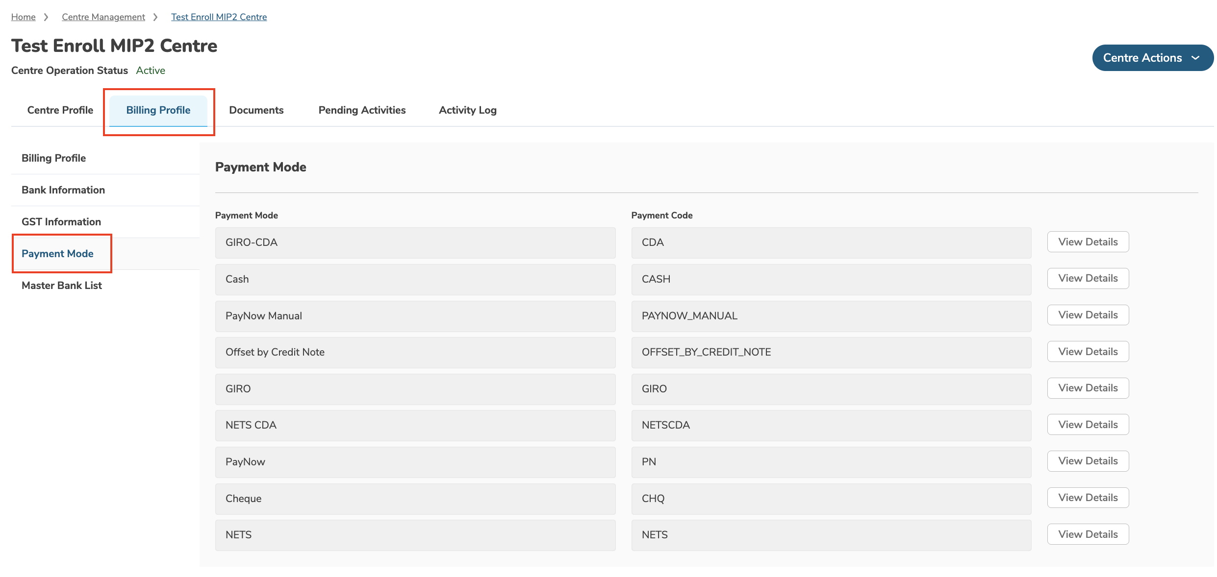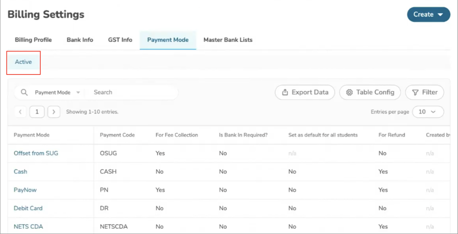 Go to the Payment Mode tab, where you will see a list of all Active Payment Modes.