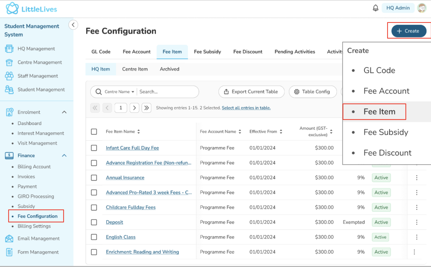 Fee Items will be listed as Active under “HQ Items” (for Finance Admin) or “Centre Items” (for Centre Admin)