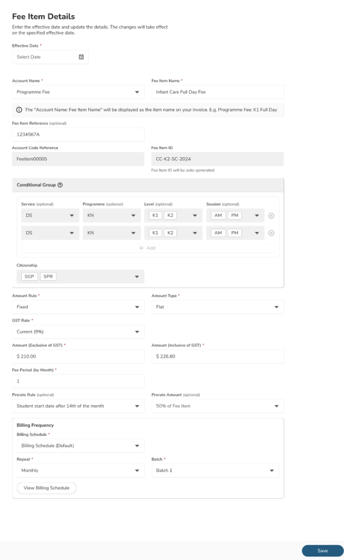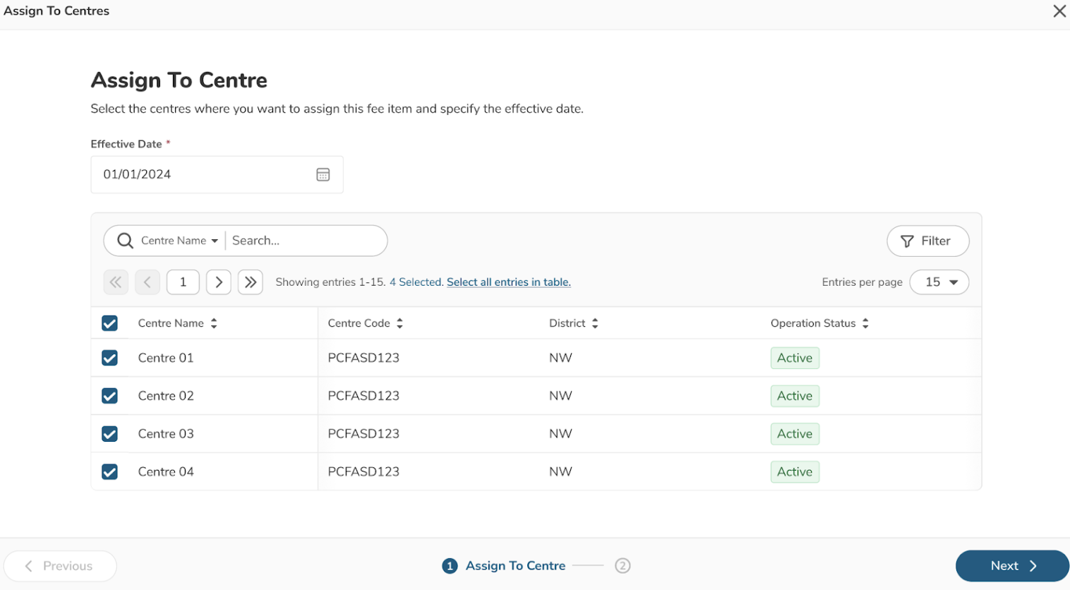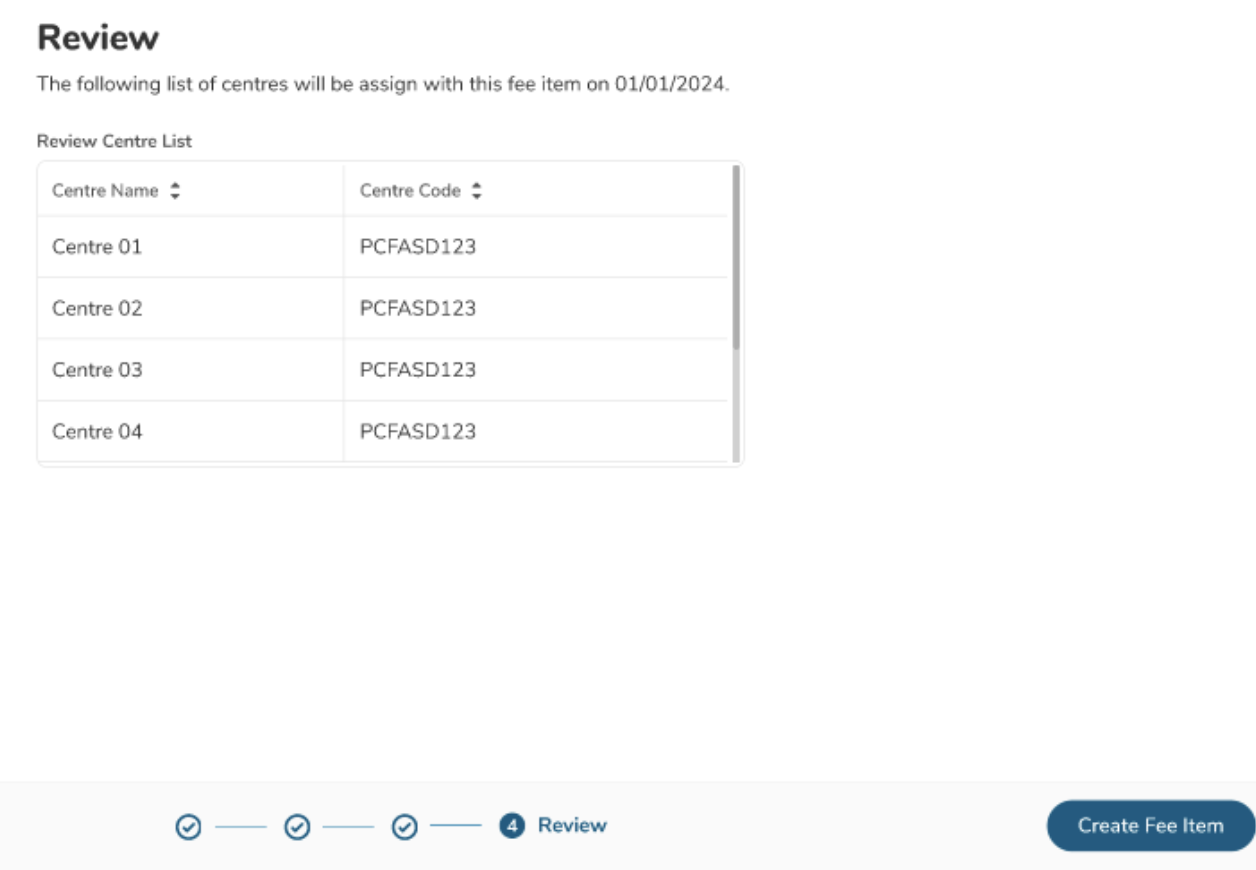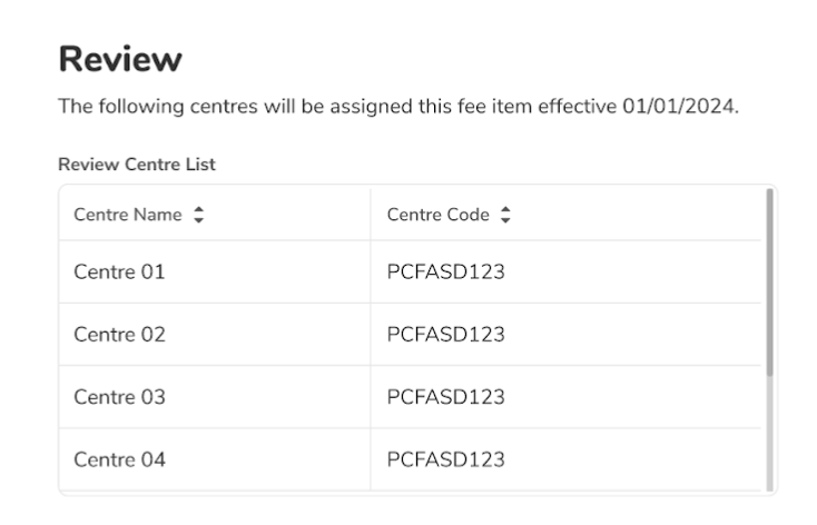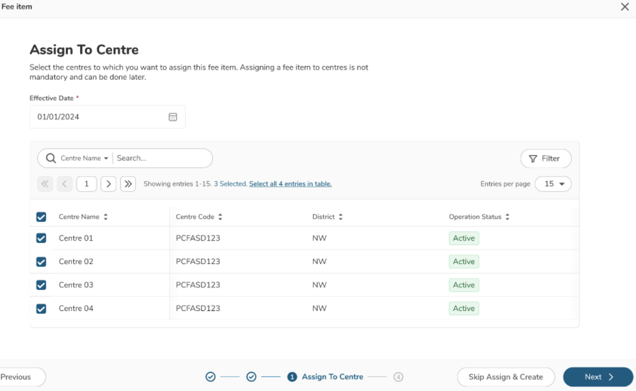 - Set the effective date to assign fee item to centre(s)