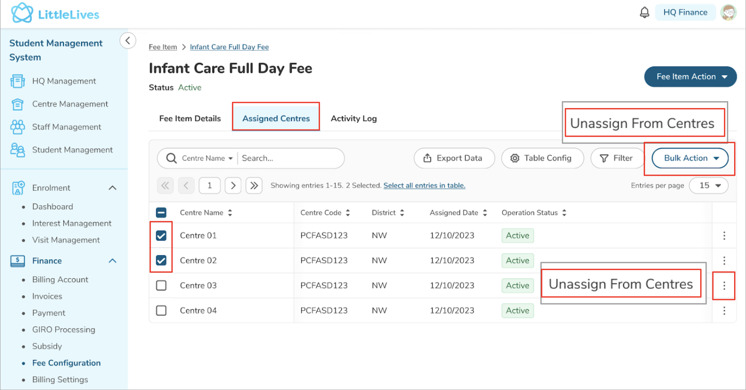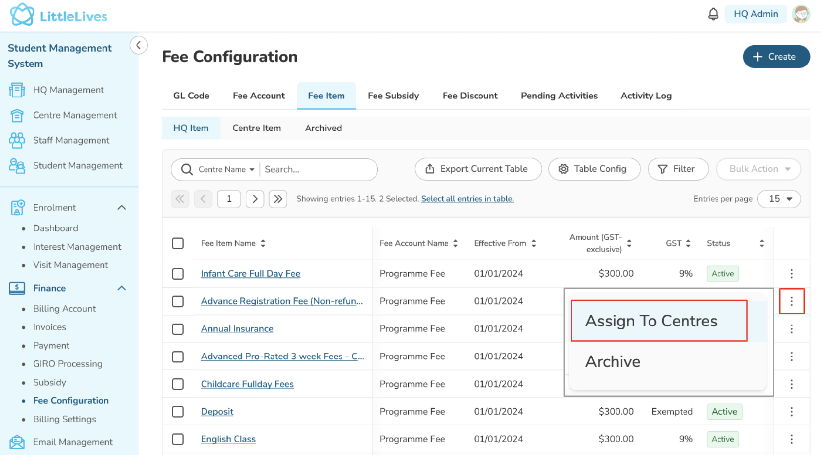 - As Finance HQ, you can select a fee item from the listing by clicking the 3-dot button and choosing "Assign to Centres" (bulk action is not available).