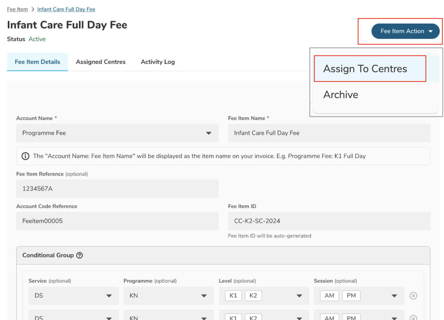 - Or, you can also go to the Fee Item Details page and click on the Fee Item Action button, then select Assign To Centres
