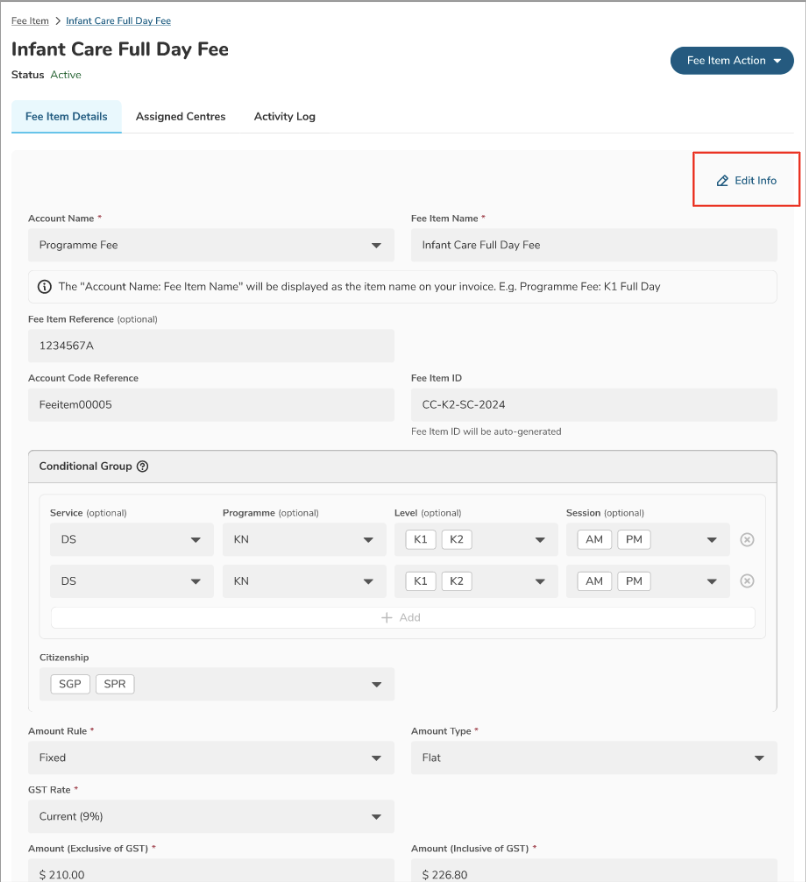Step 2: Go to the Fee Item Details page → click Edit Info