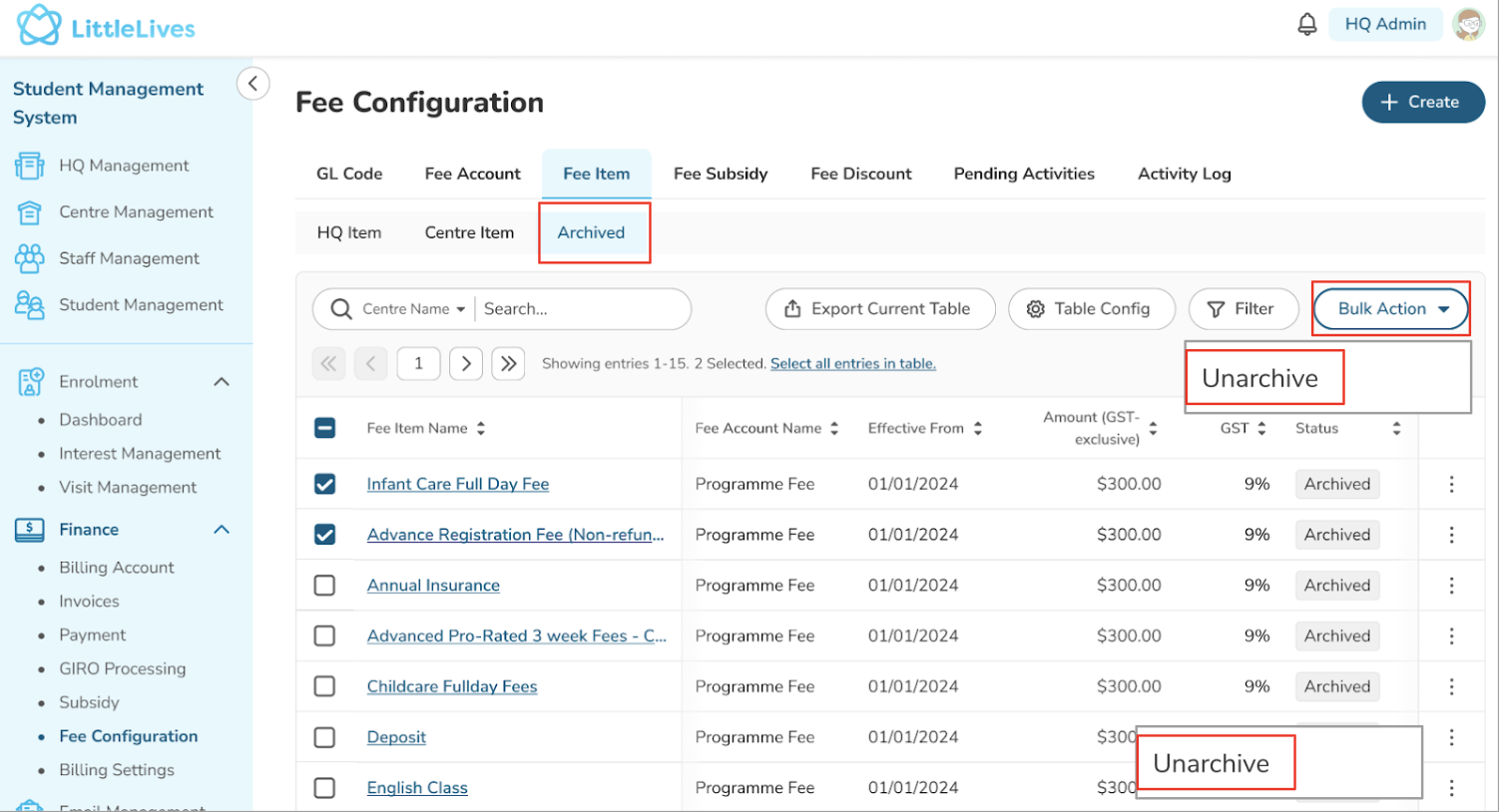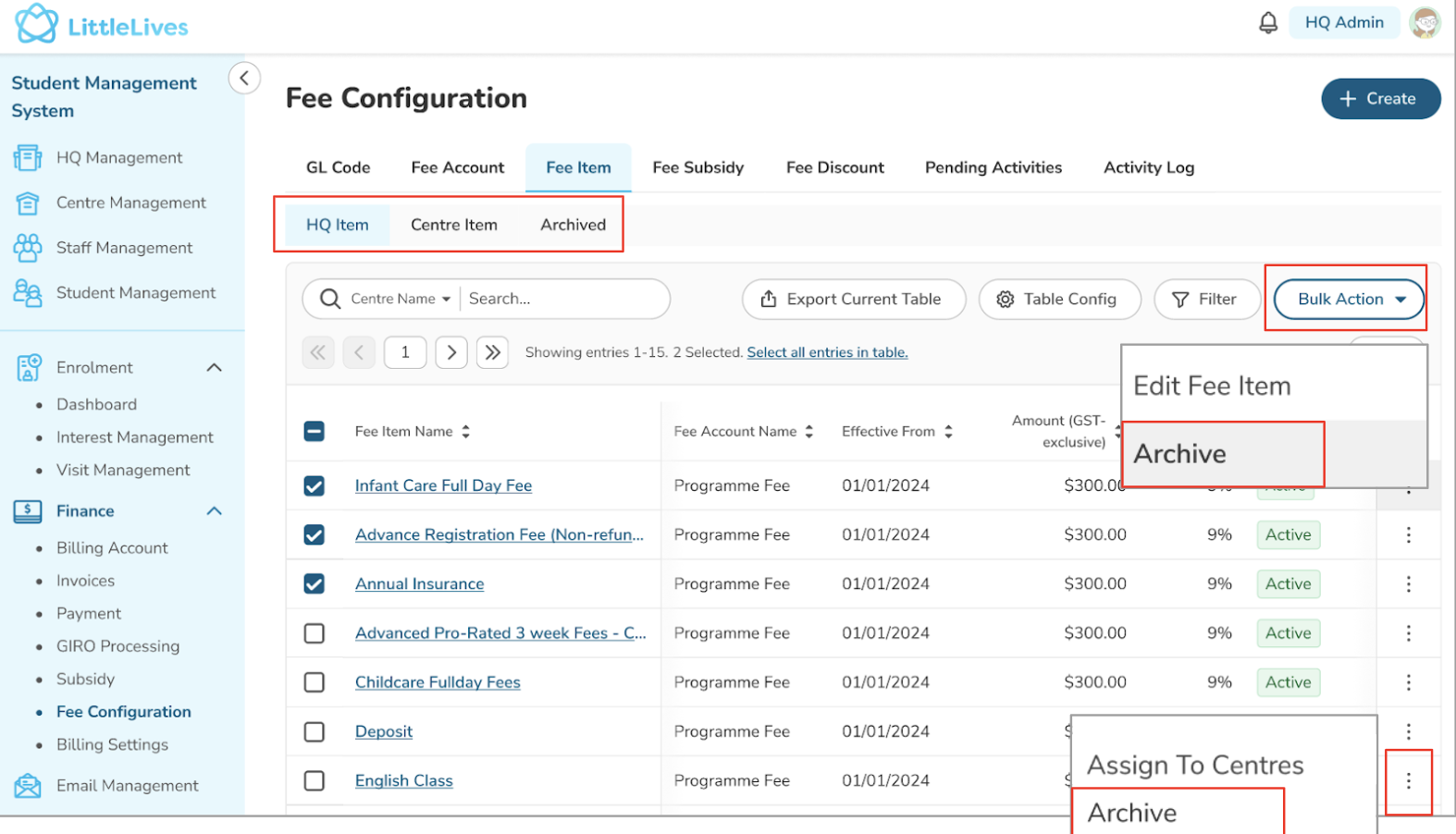 - As Finance HQ, you can see and edit all 3 tabs (HQ Item, Centre Item, and Archived) displayed under Fee Item