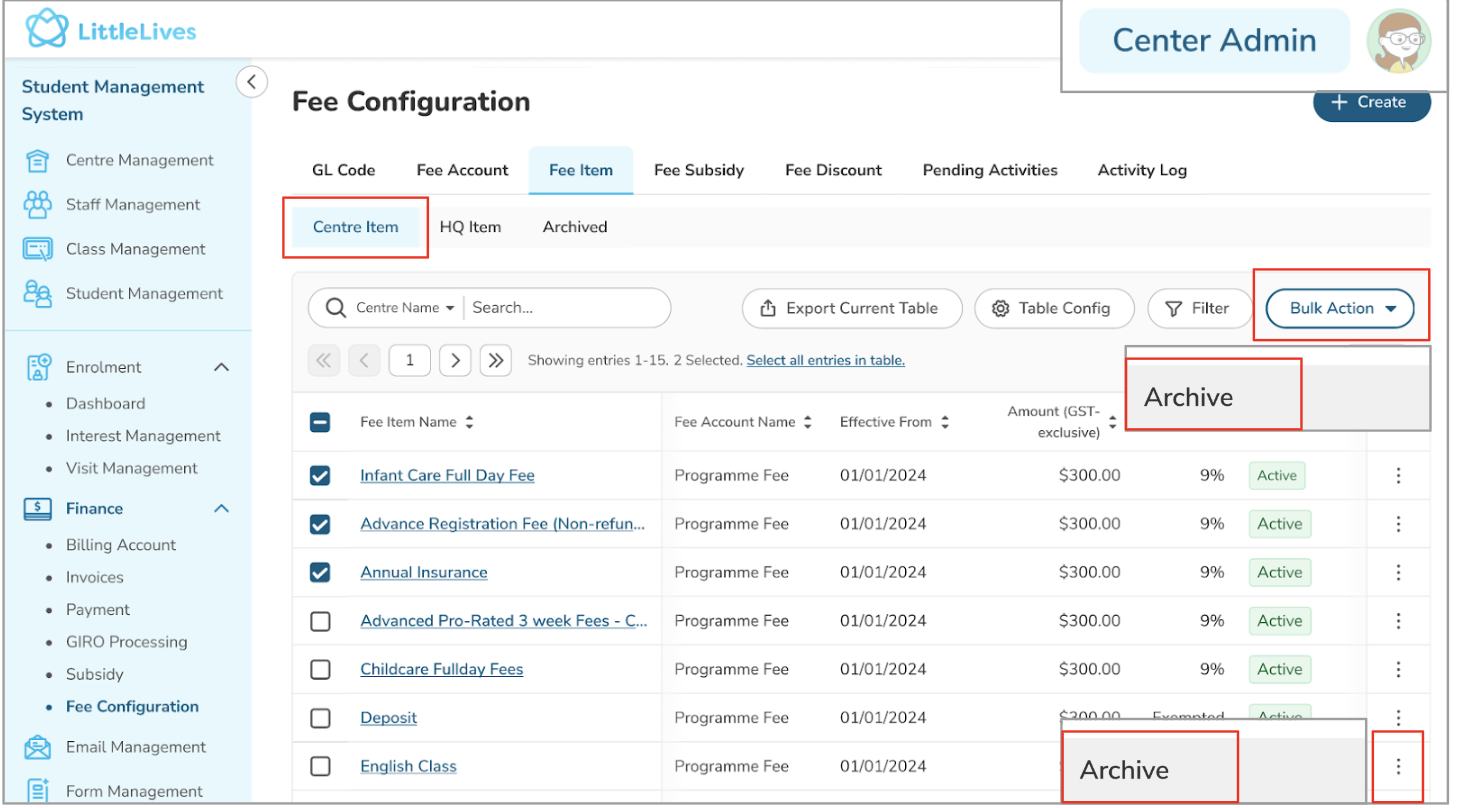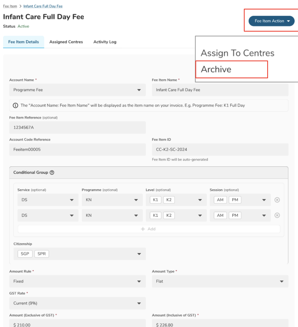 - Under the Centre Items tab, Centre Admins can only see the Archive button for Fee Item details associated with their respective centres