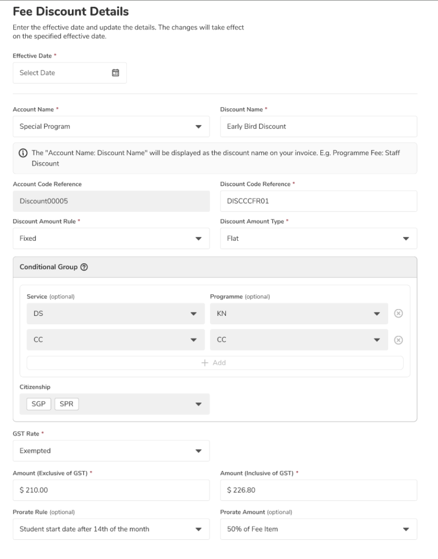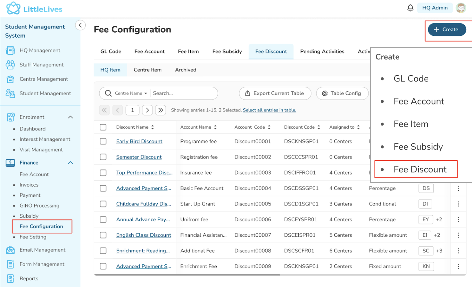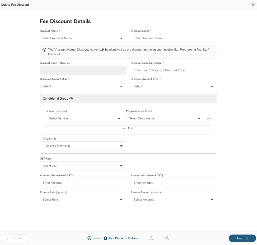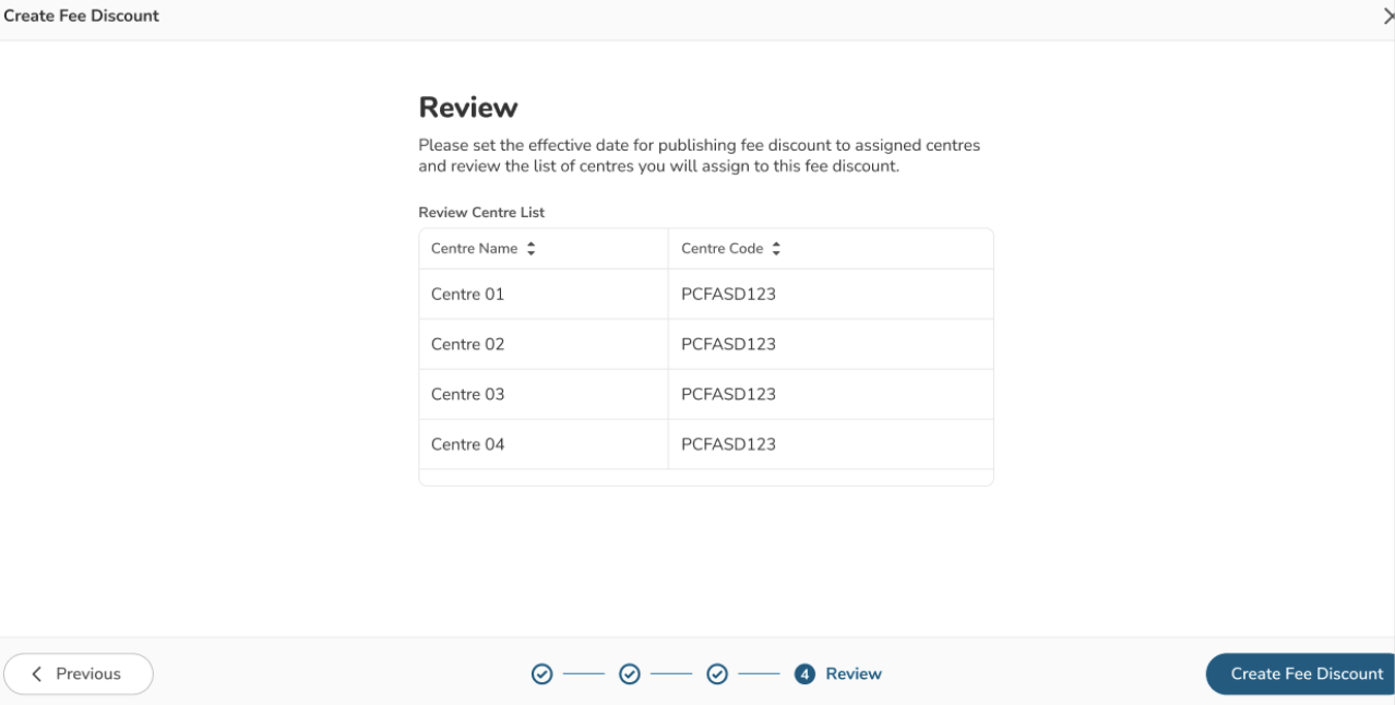 Only Finance Admins and Centre Admins can create new Fee Discounts.