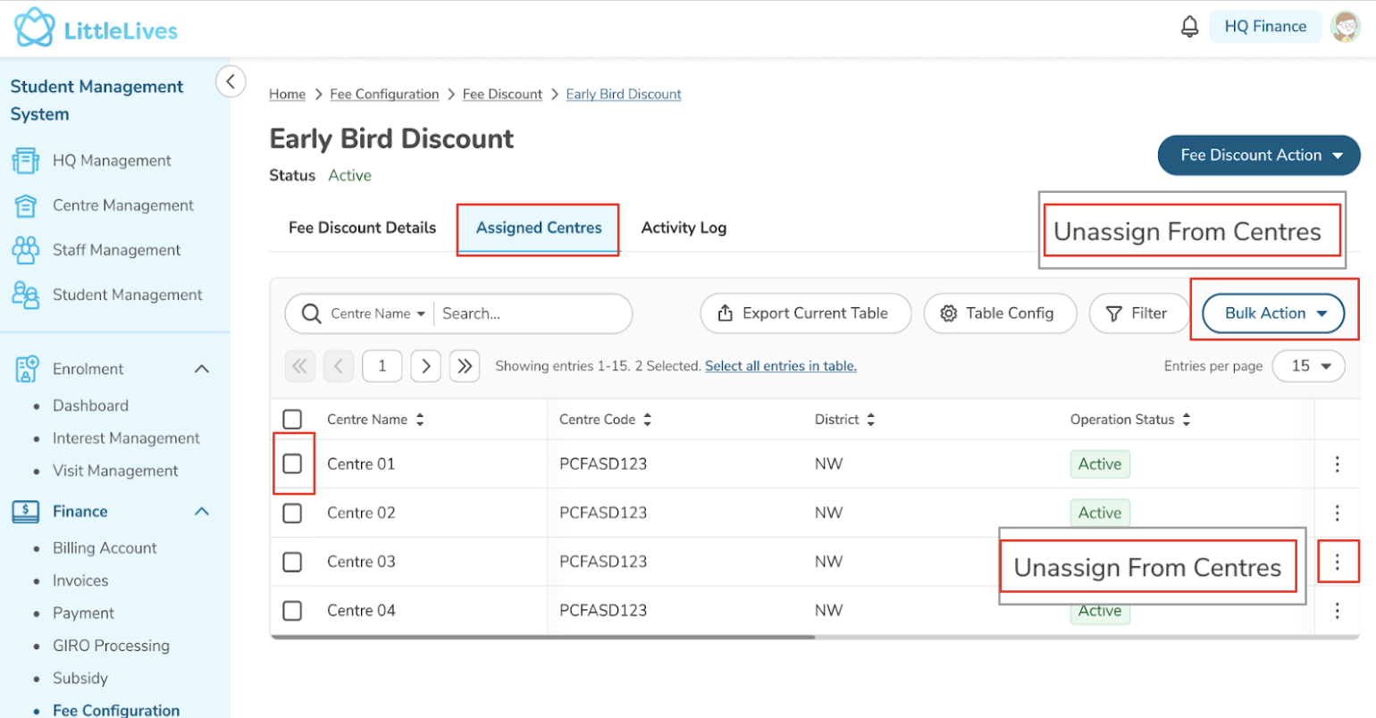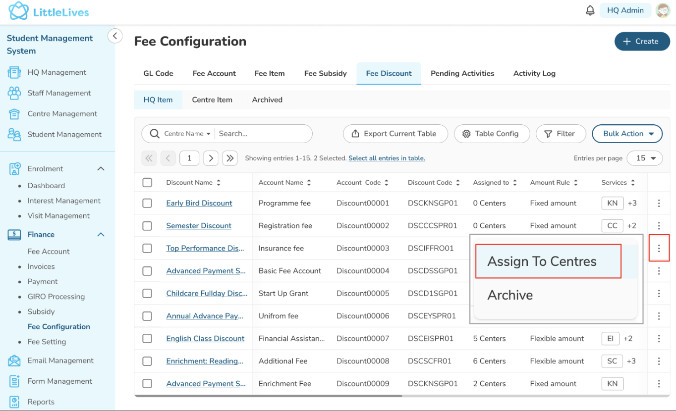 Finance HQ can click on the 3-dot button next to a discount and select Assign To Centres.