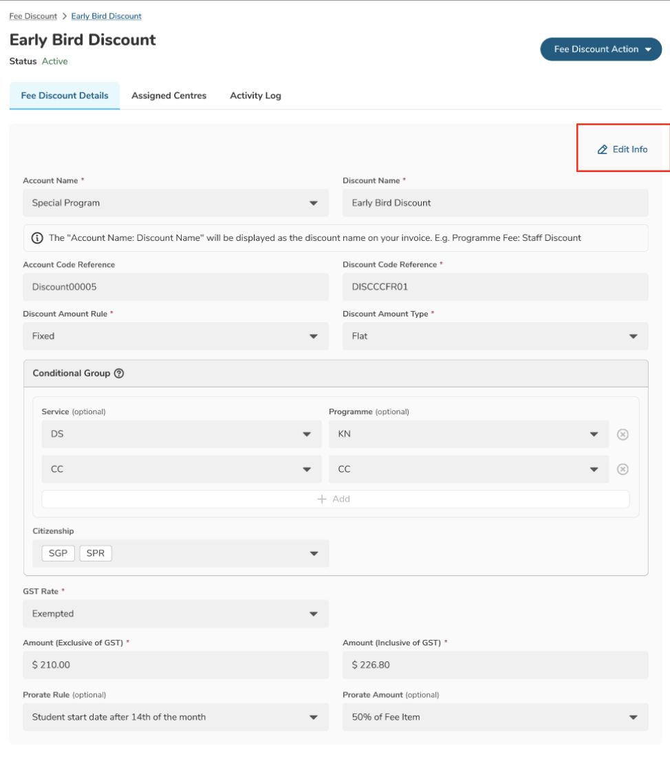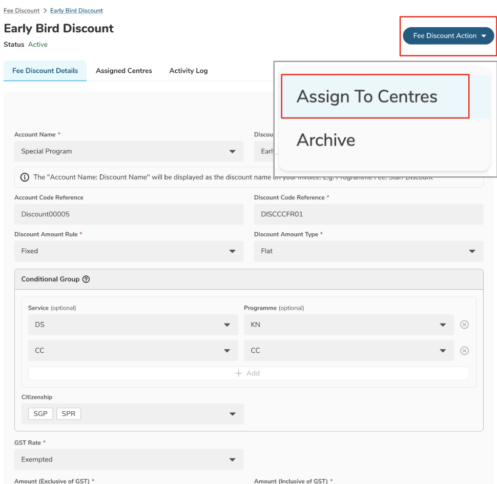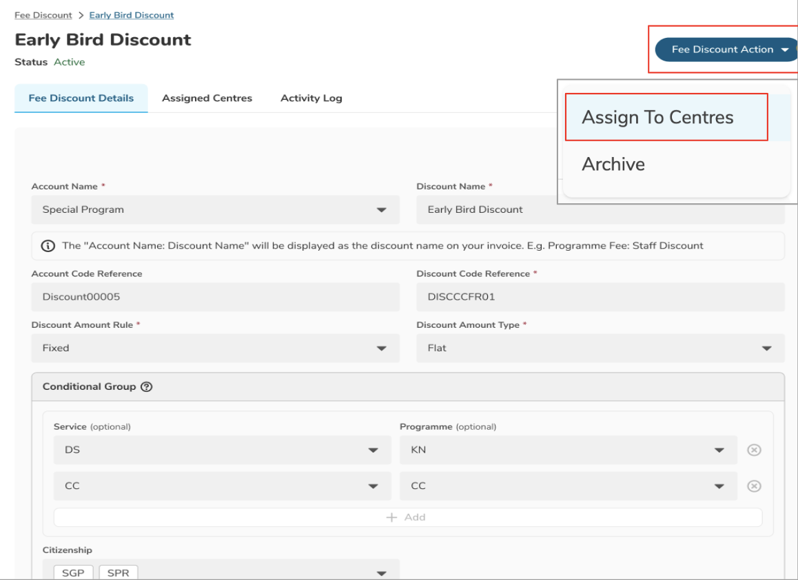 You may assign the Fee Discount to one or more centres, or save it without assignment.