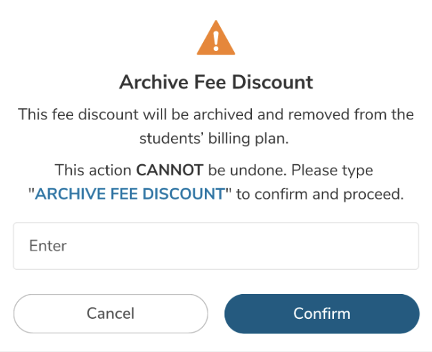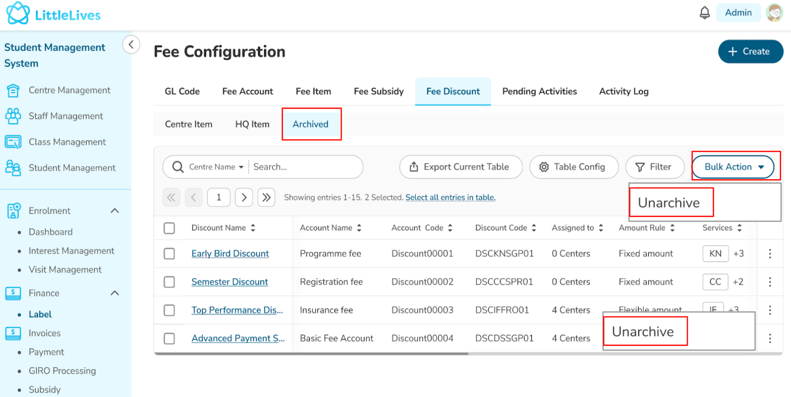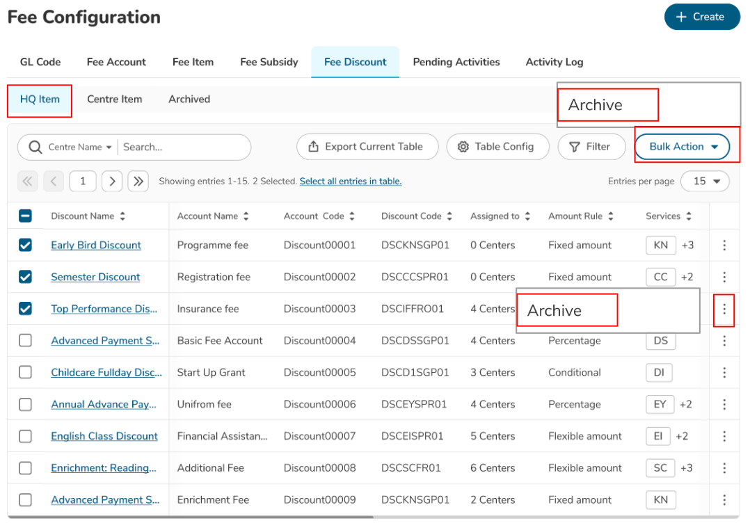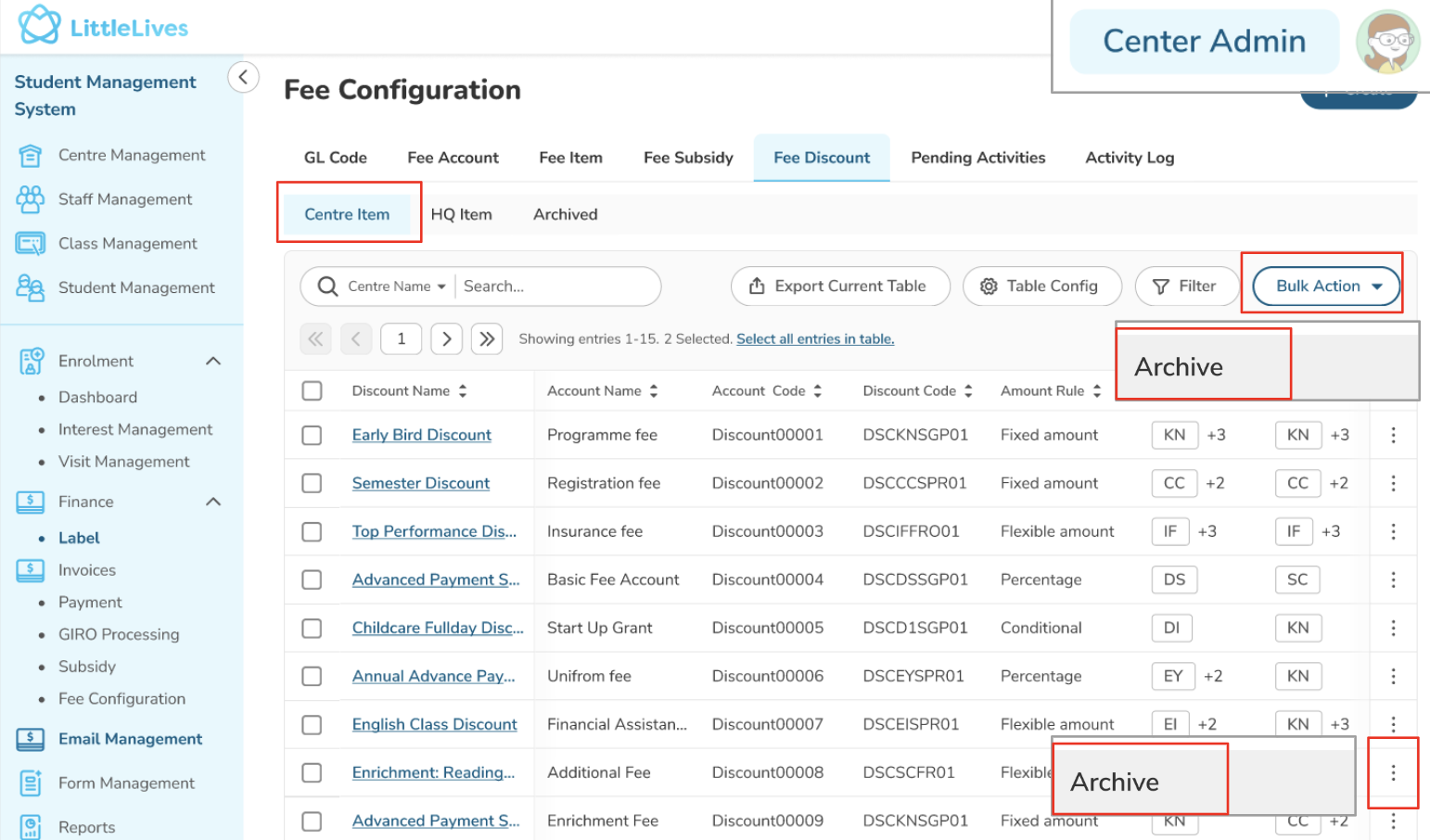 Centre Admins can only archive Fee Discounts listed under the Centre Items tab.
