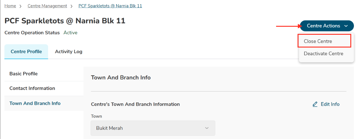 Click on the "Center Actions" button located in the center's dashboard.