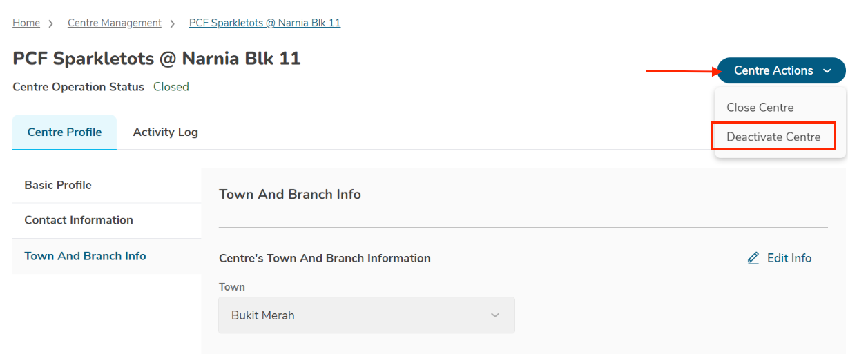 From the dropdown menu, select "Deactivate Center."
