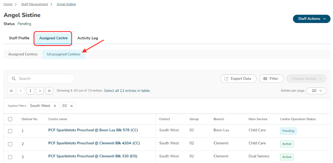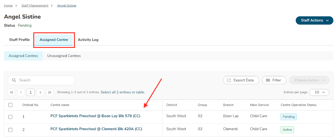 Go to the Staff Information page and click on the "Assigned Center" tab.