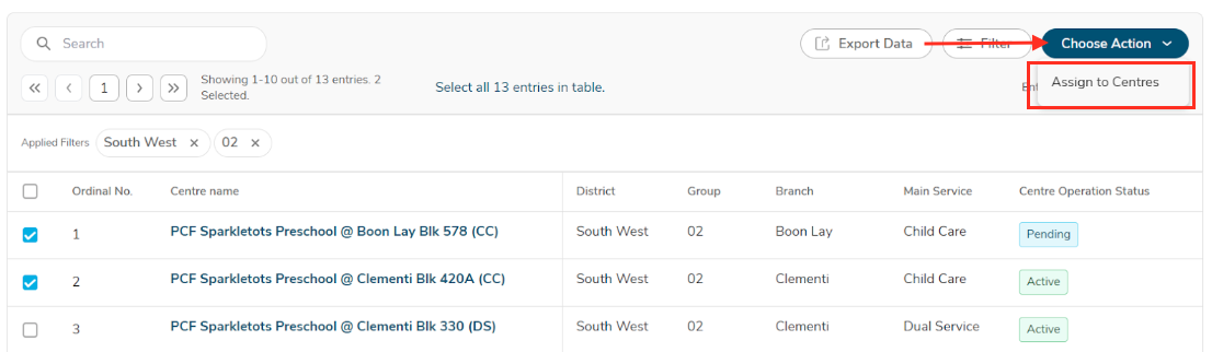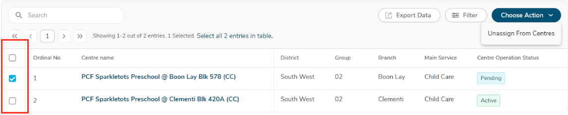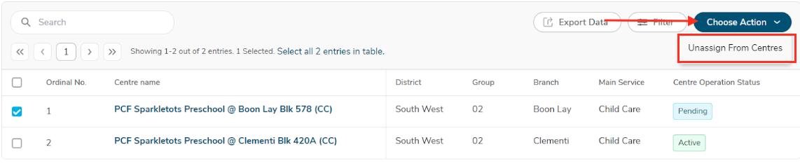 Click on "Unassign Centres" if you are removing a previous assignment.