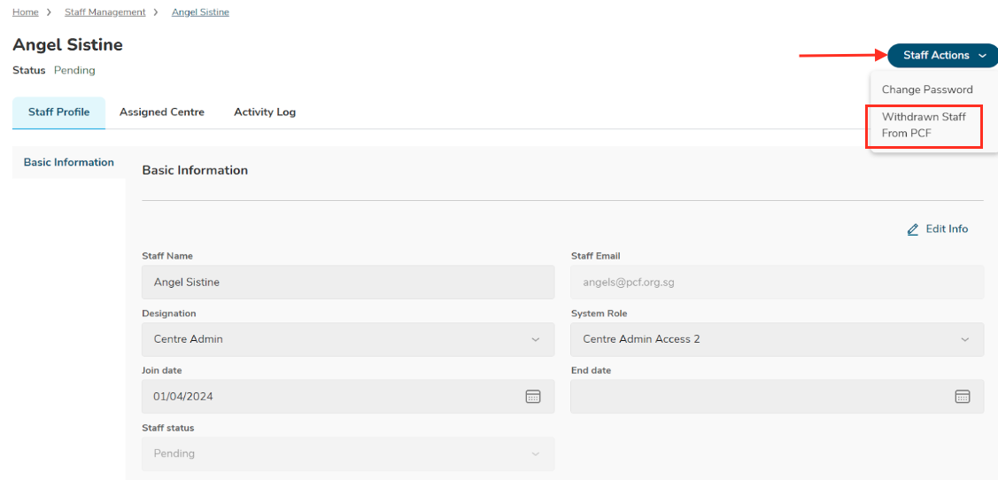 Step 3: In the Staff Information page, click on "Staff Actions" and select "Withdrawn Staff from PCF".
