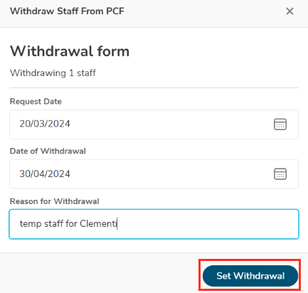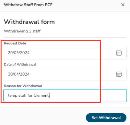 Step 4: In the Withdraw Staff from PCF window, fill in the required fields.