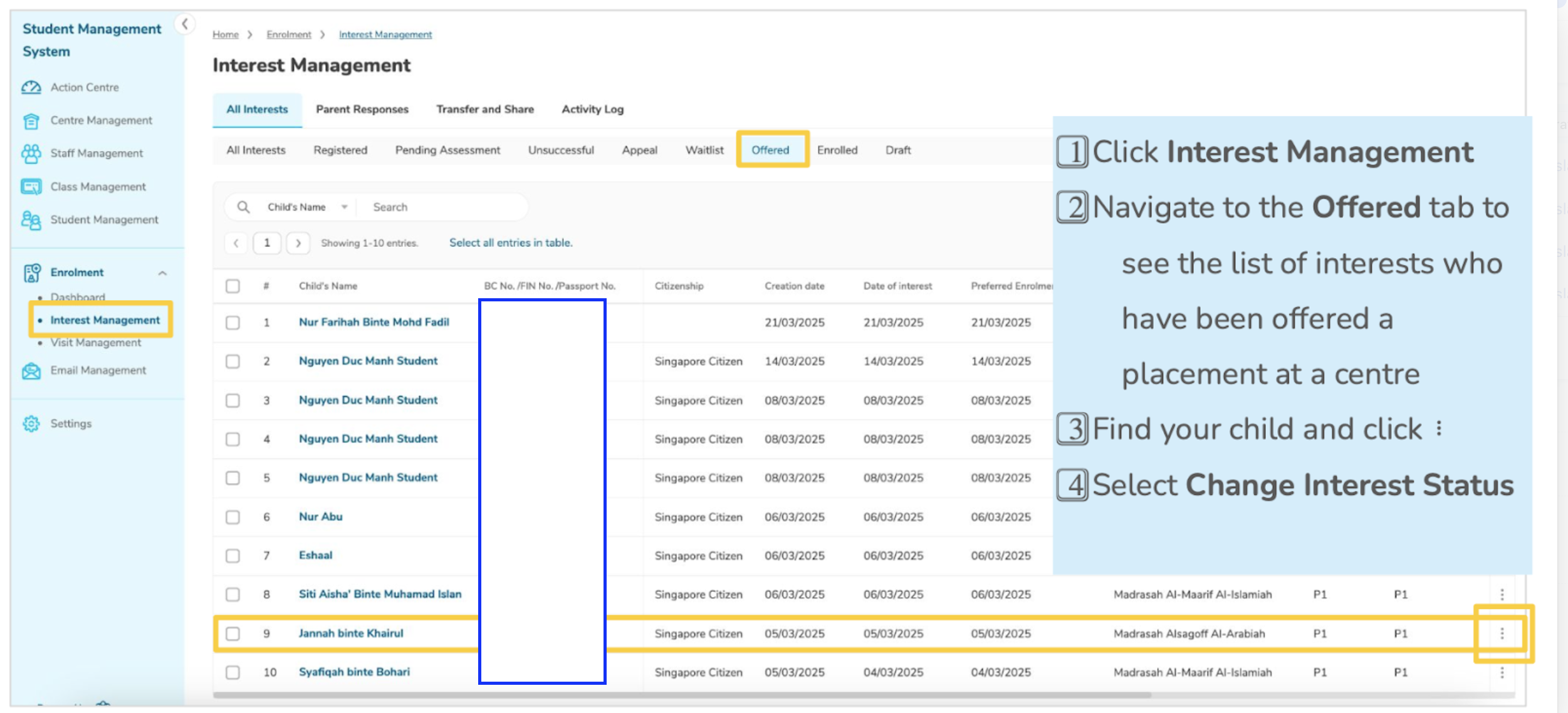 Click the ⋮ icon next to the student and select 'Change Interest Status'.