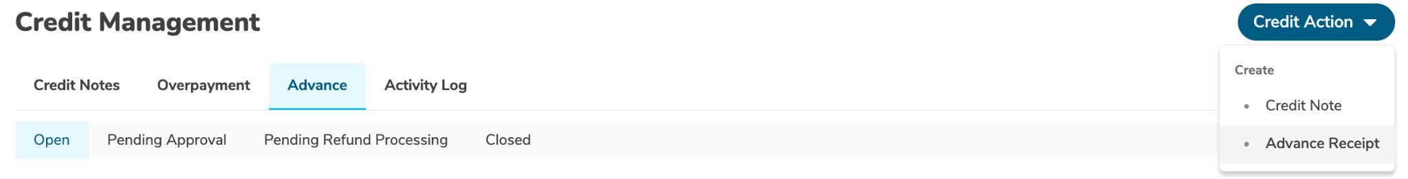 • Go to Credit Management → Advance → Credit Action → Advance Receipt