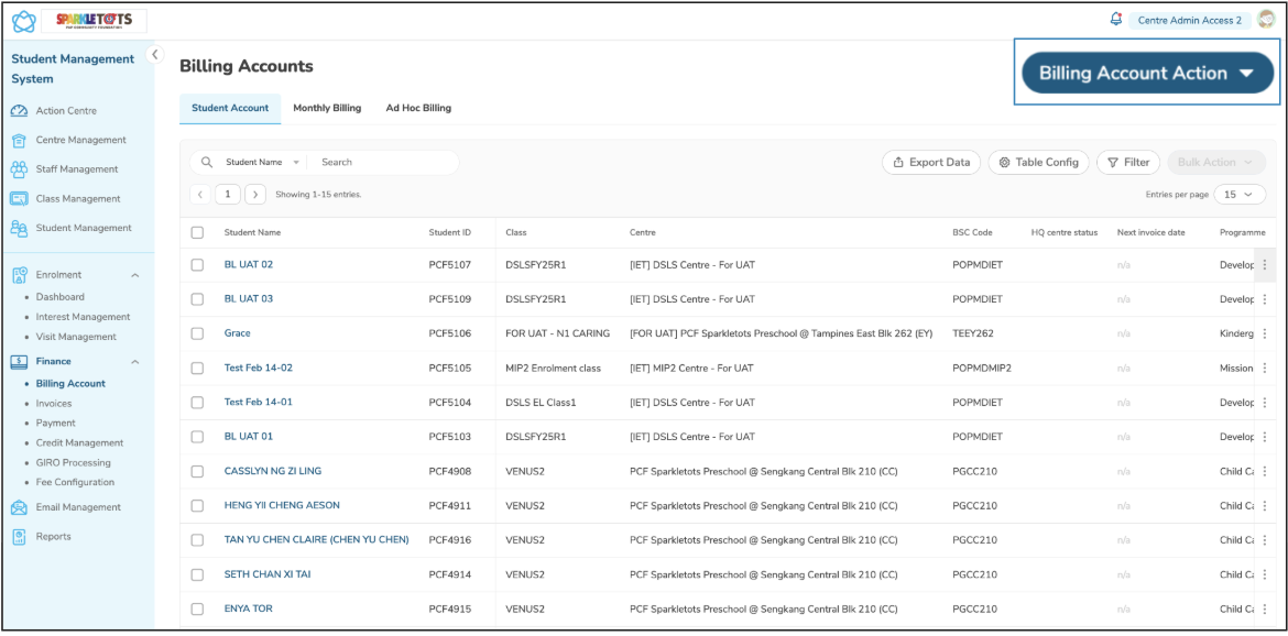 Click on Billing Account Action dropdown at the top