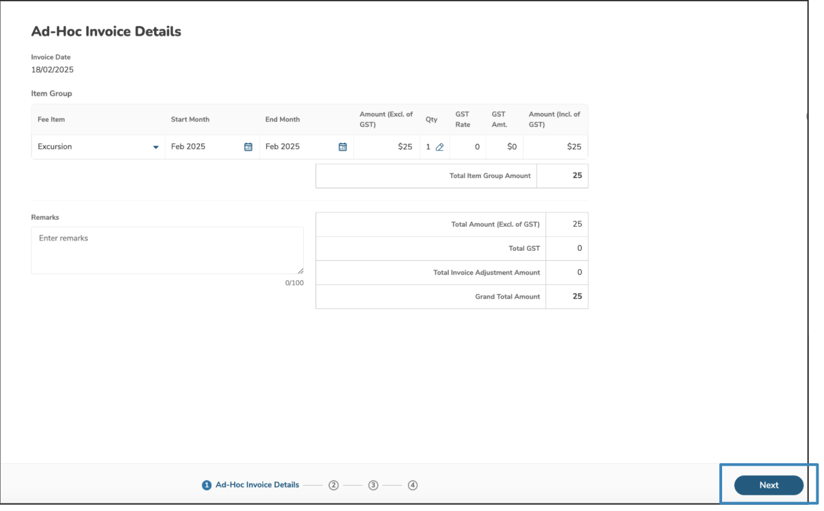 Fill in all required ad-hoc invoice information: