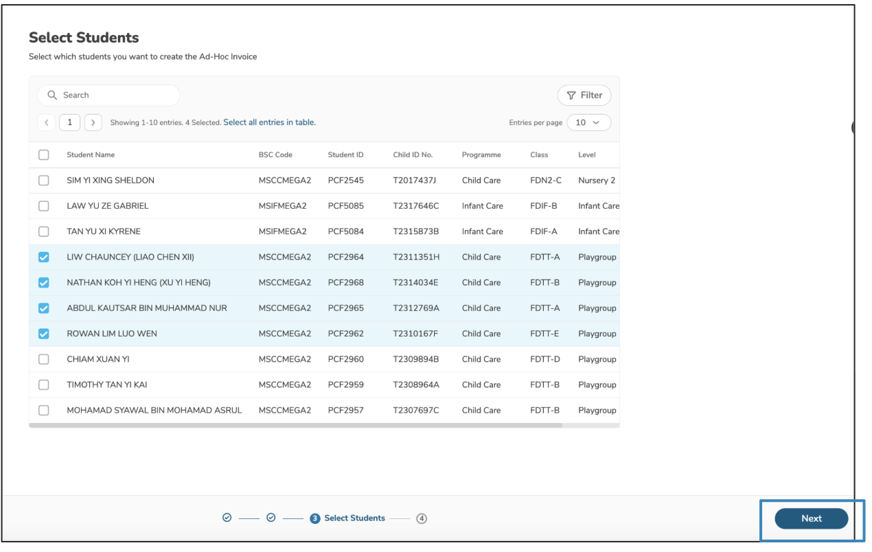 Here are the steps to create Ad-Hoc invoices for multiple students: