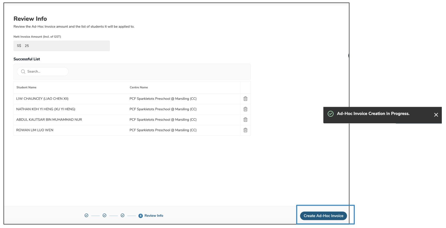 A popup notification will show that the Ad-Hoc Invoice creation in Progress