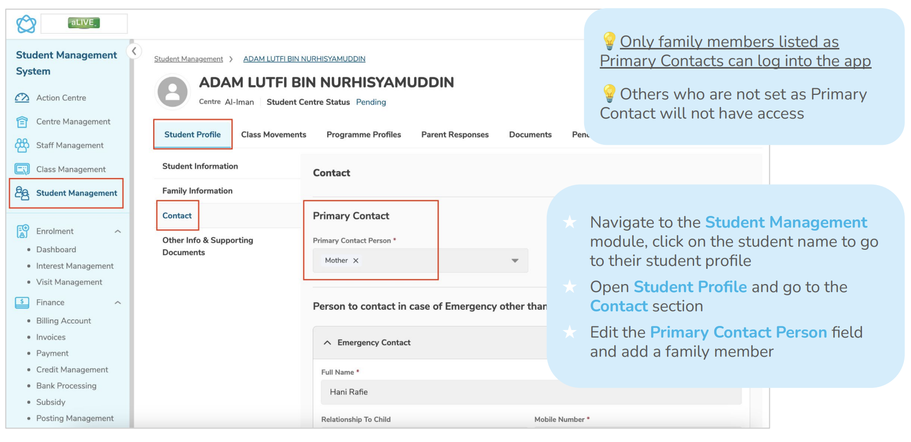 - If parent cannot log in → Check if you have set the parent as Primary Contact