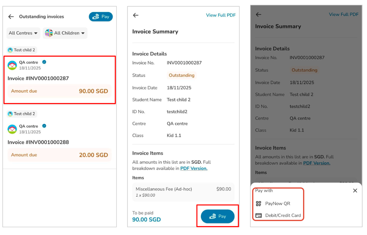 Open the Invoices section and tap Pay Now on the invoice you want to settle.