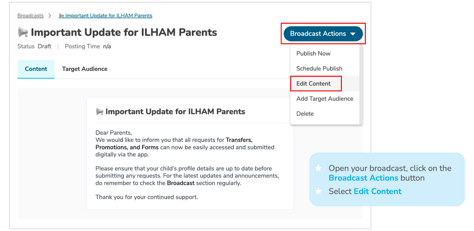 ⚠️ Editing a Published broadcast is immediate and cannot be undone.
